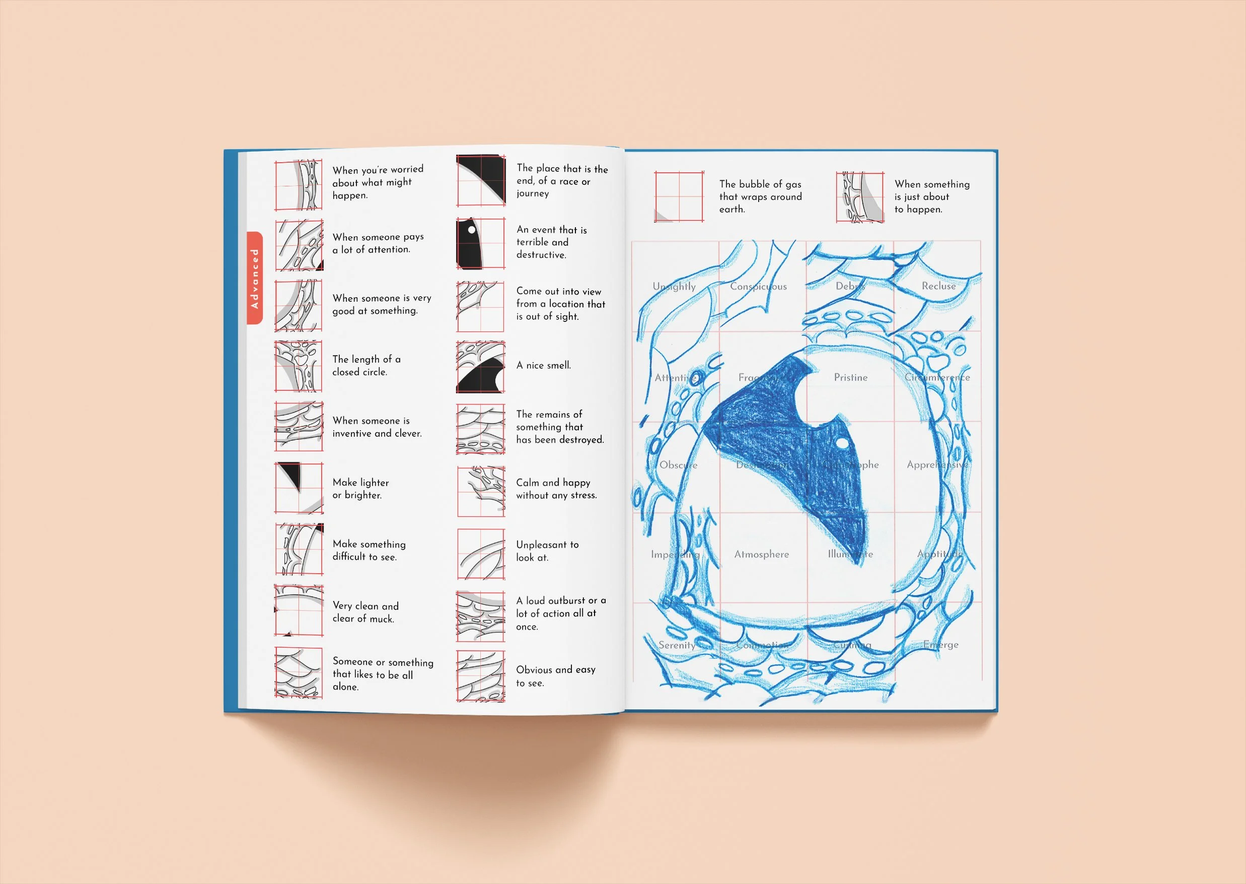 The cartoony doodle style illustration was used to set the tone for the interactive element. Key vocabulary is highlighted throughout the story. Users are prompted to contextualize this vocabulary using the stories they read and fill out the drawing grids by matching definitions correctly. Similar to a cross word but with art, kids will know whether they have the correct answer if the drawings align. The art and tone is designed to feel accessible and achievable for the demographic prompting them to give it a go.